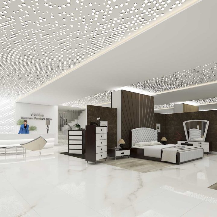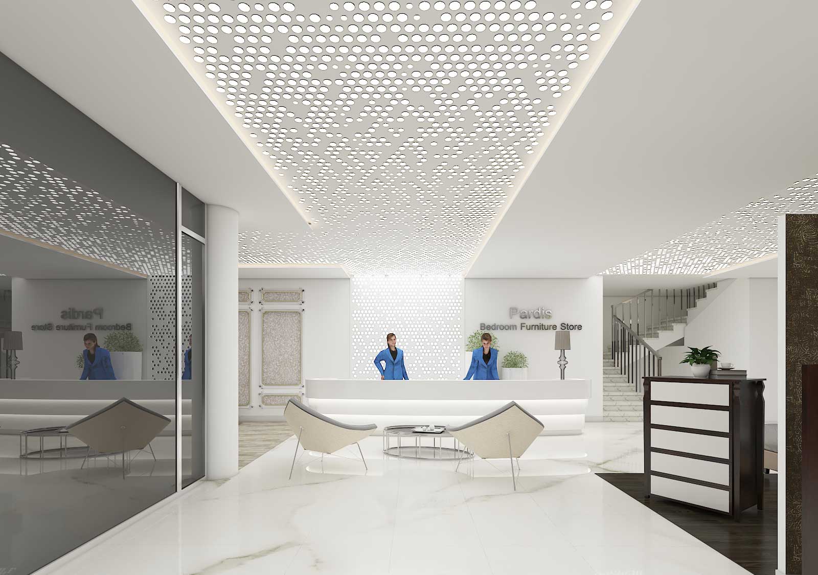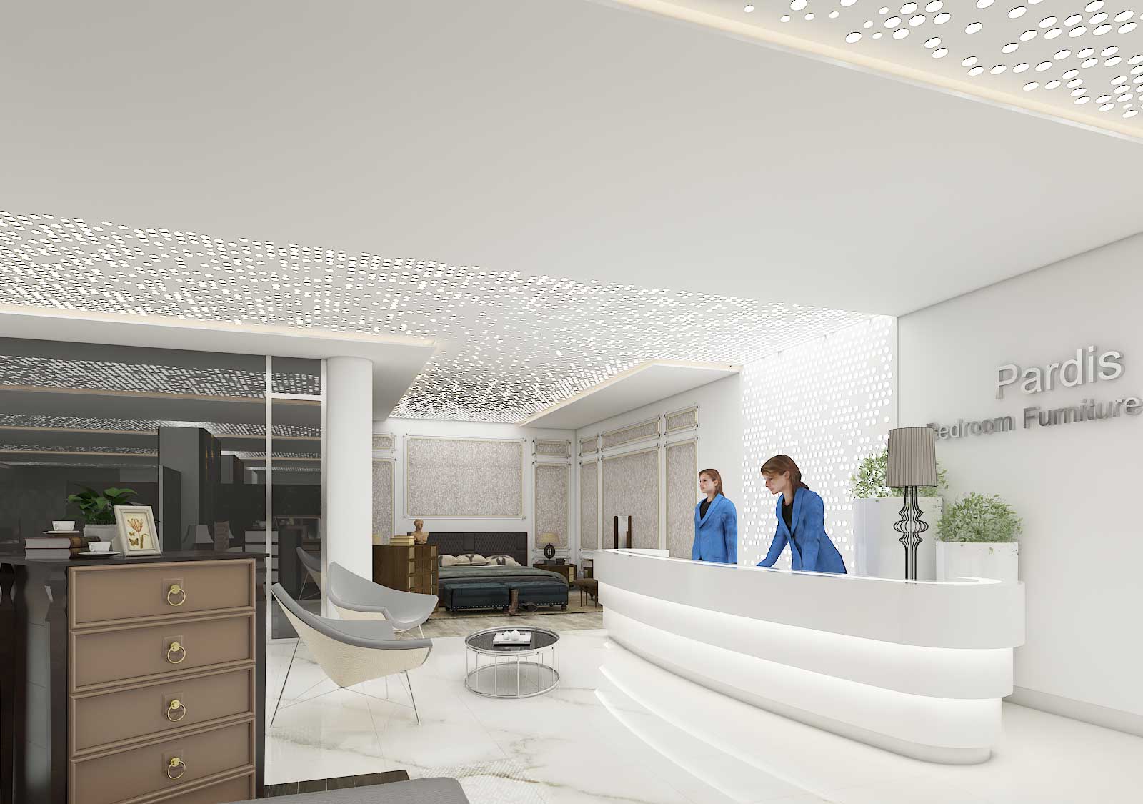 •لوگوی برند “Pardis Bedroom Furniture” روی دیوار پشت پذیرش، همراستا با سبک لوکس فضا.