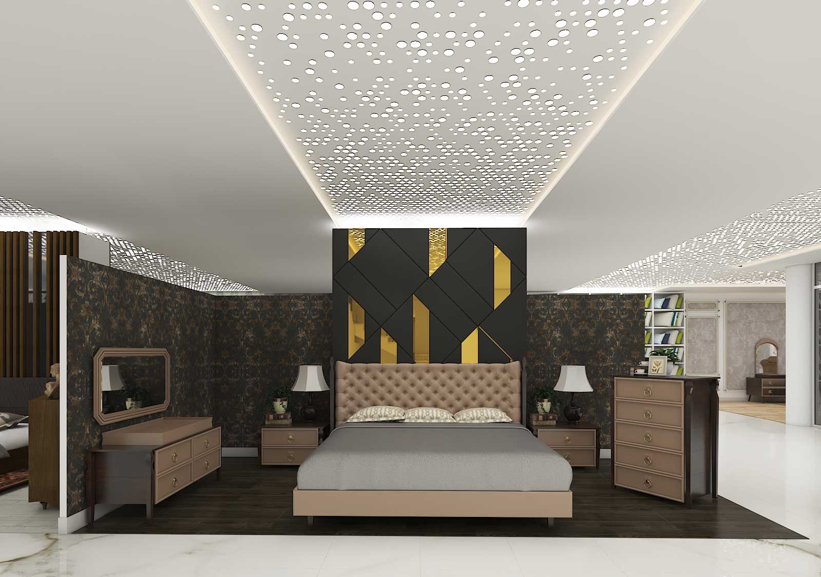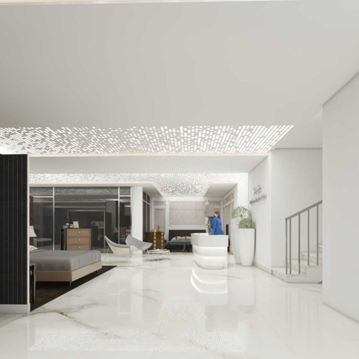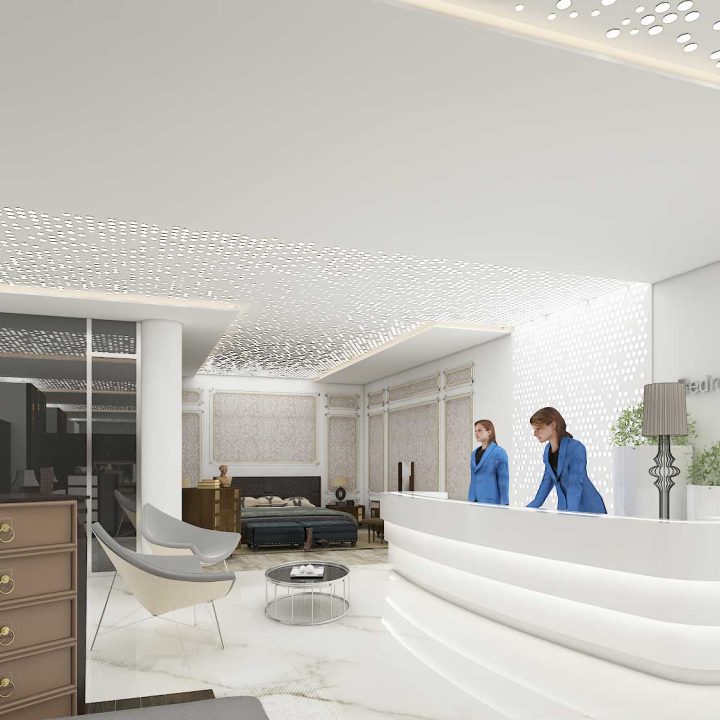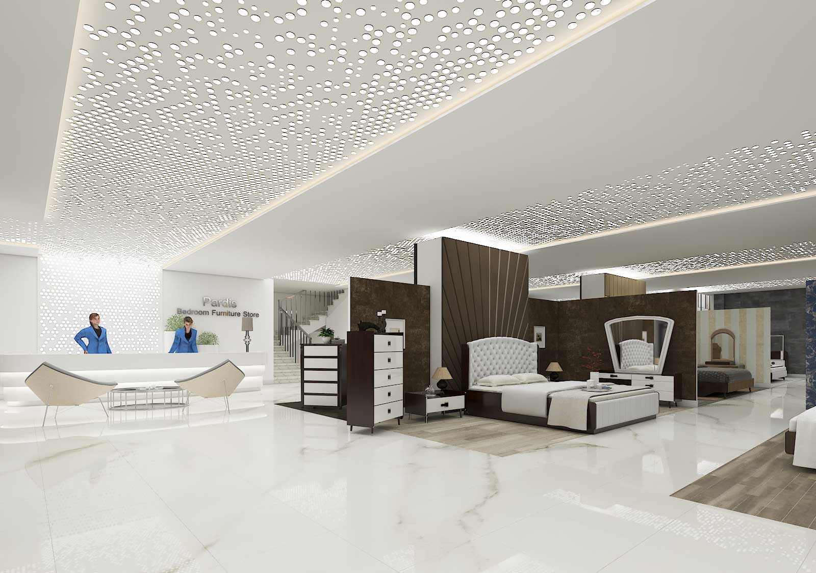 •لوگوی برند “Pardis Bedroom Furniture” روی دیوار پشت پذیرش، همراستا با سبک لوکس فضا.