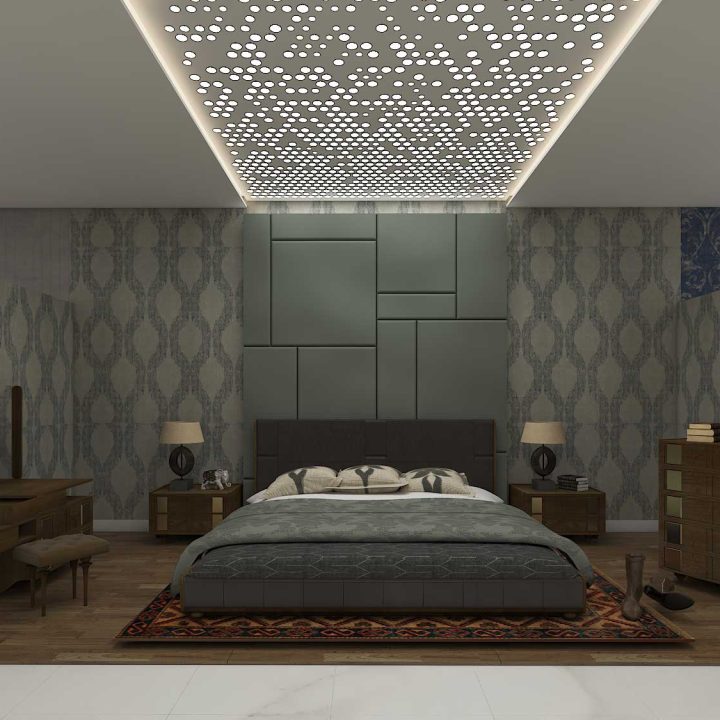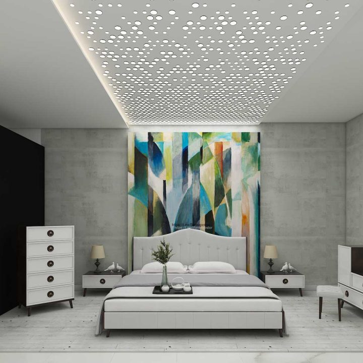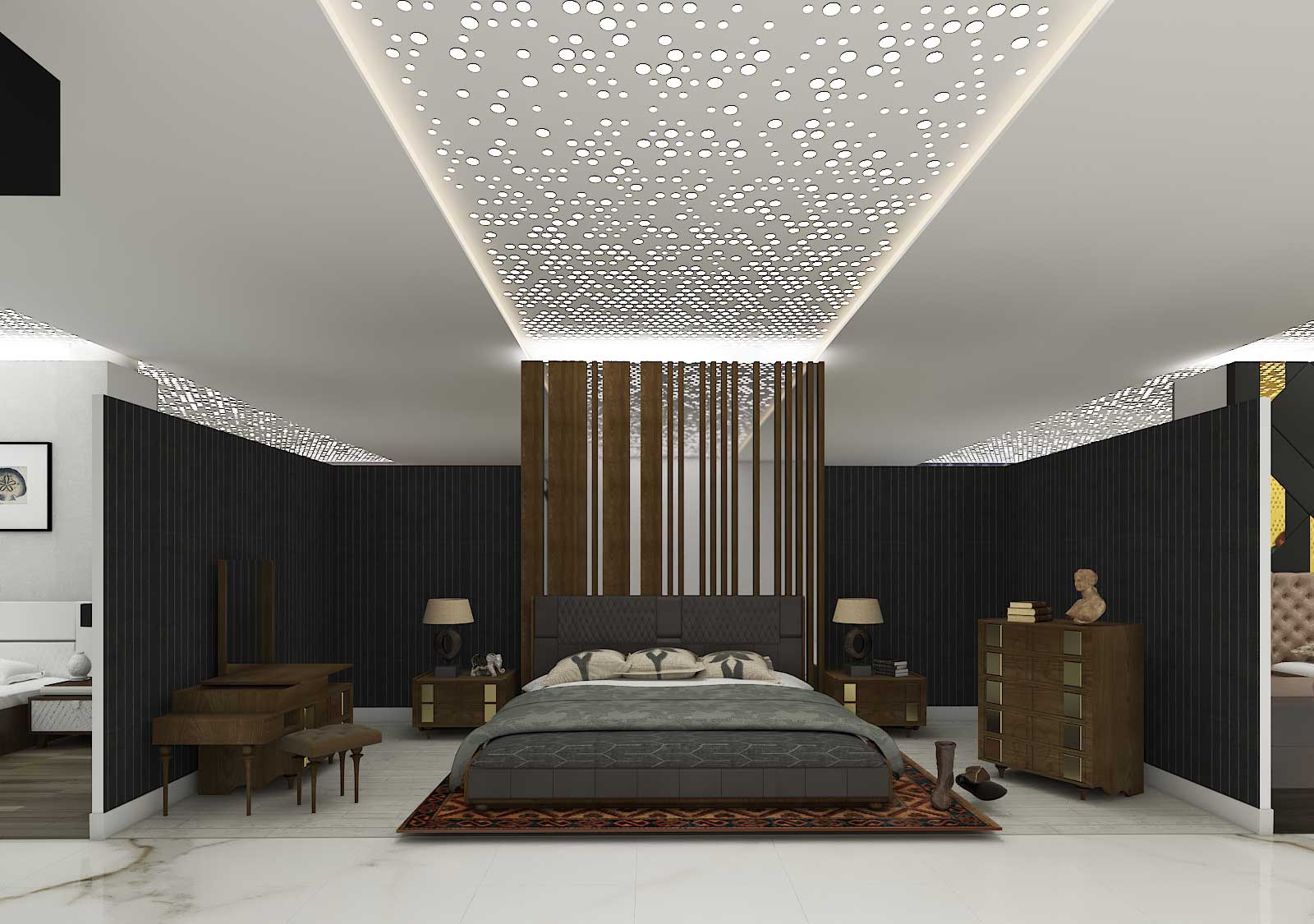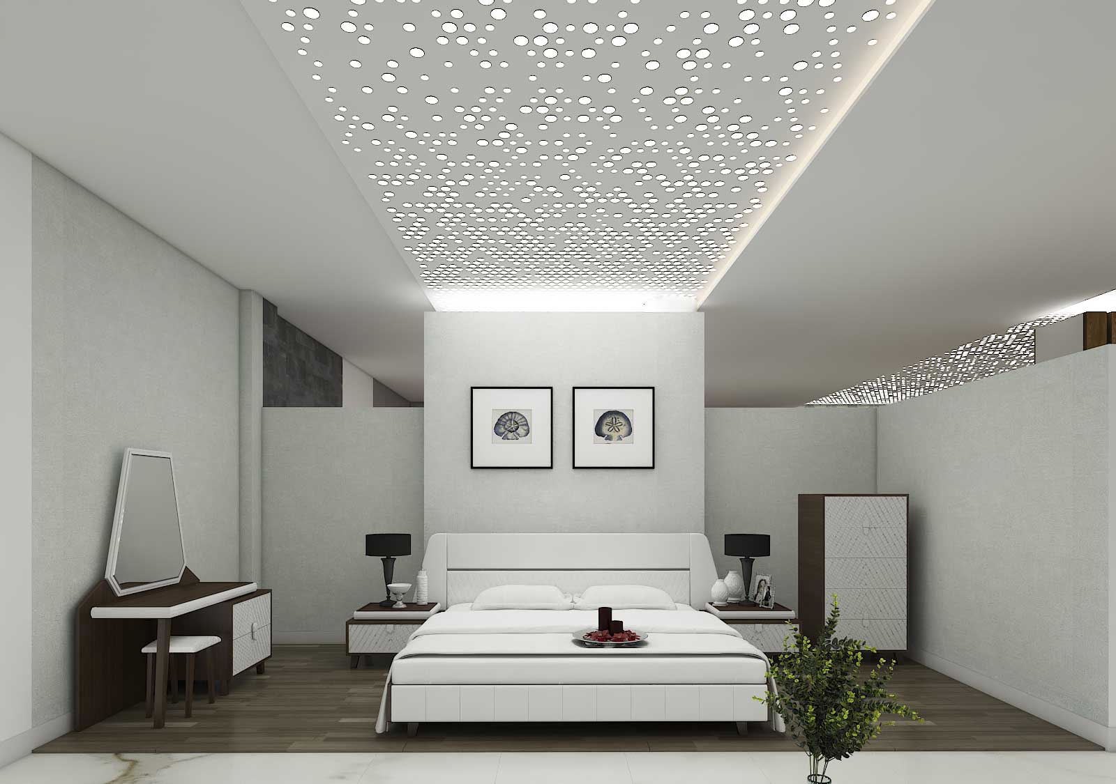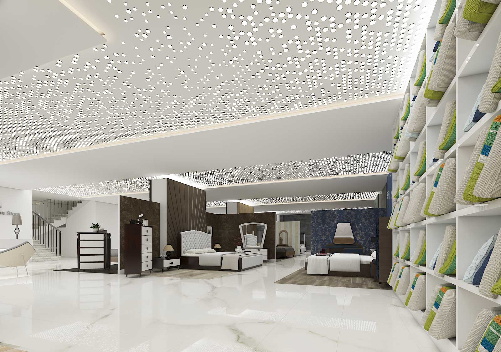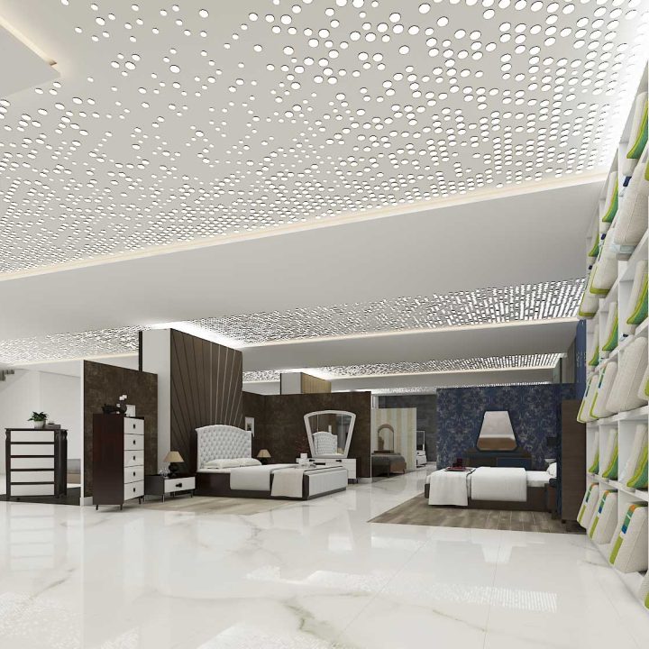 •سقف با پنلهای سوراخدار و نورپردازی یکنواخت → ایجاد جلوه بصری خاص و حس عمق.
