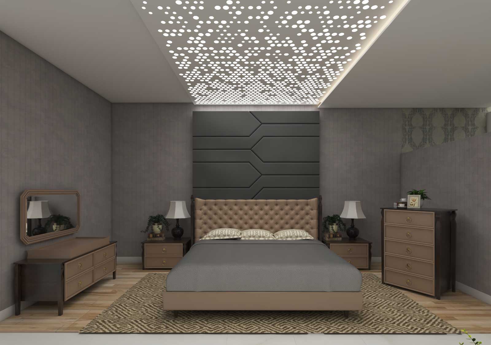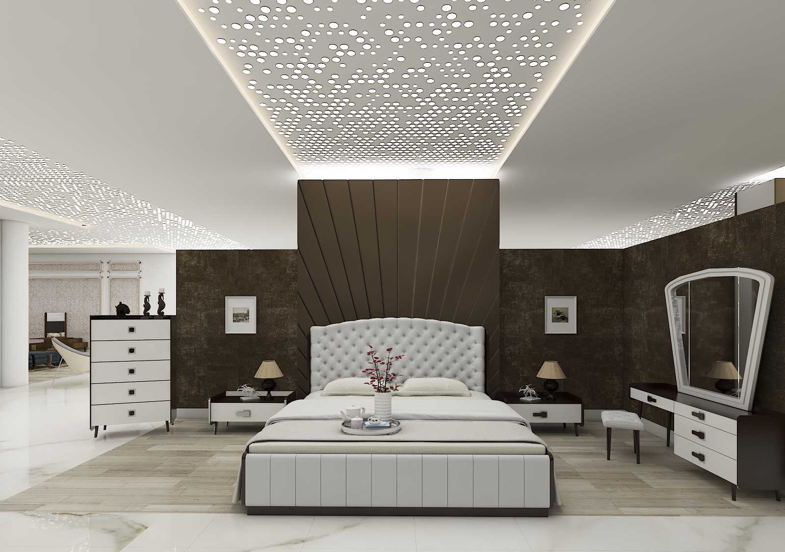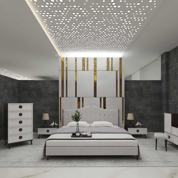 •تختخوابها و لوازم جانبی در پسزمینه با دکور هماهنگ قرار گرفتهاند.