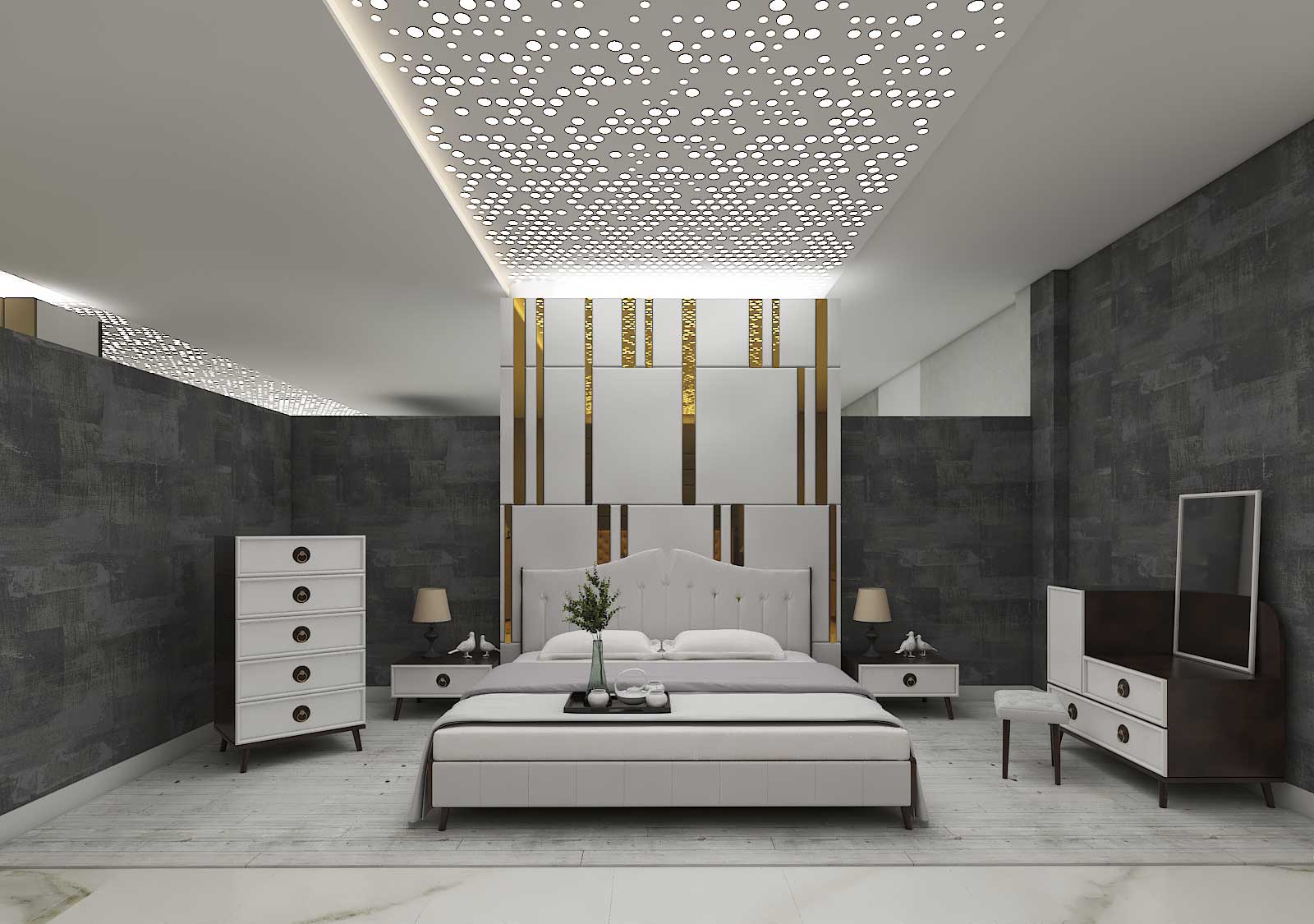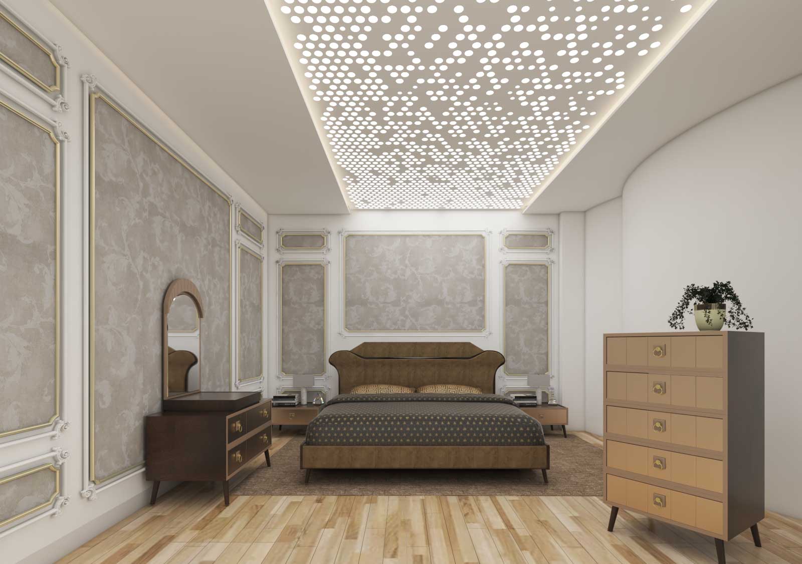 •مدرن مینیمال با لمسهای کلاسیک (قاببندی دیوارها و جزئیات طلایی).