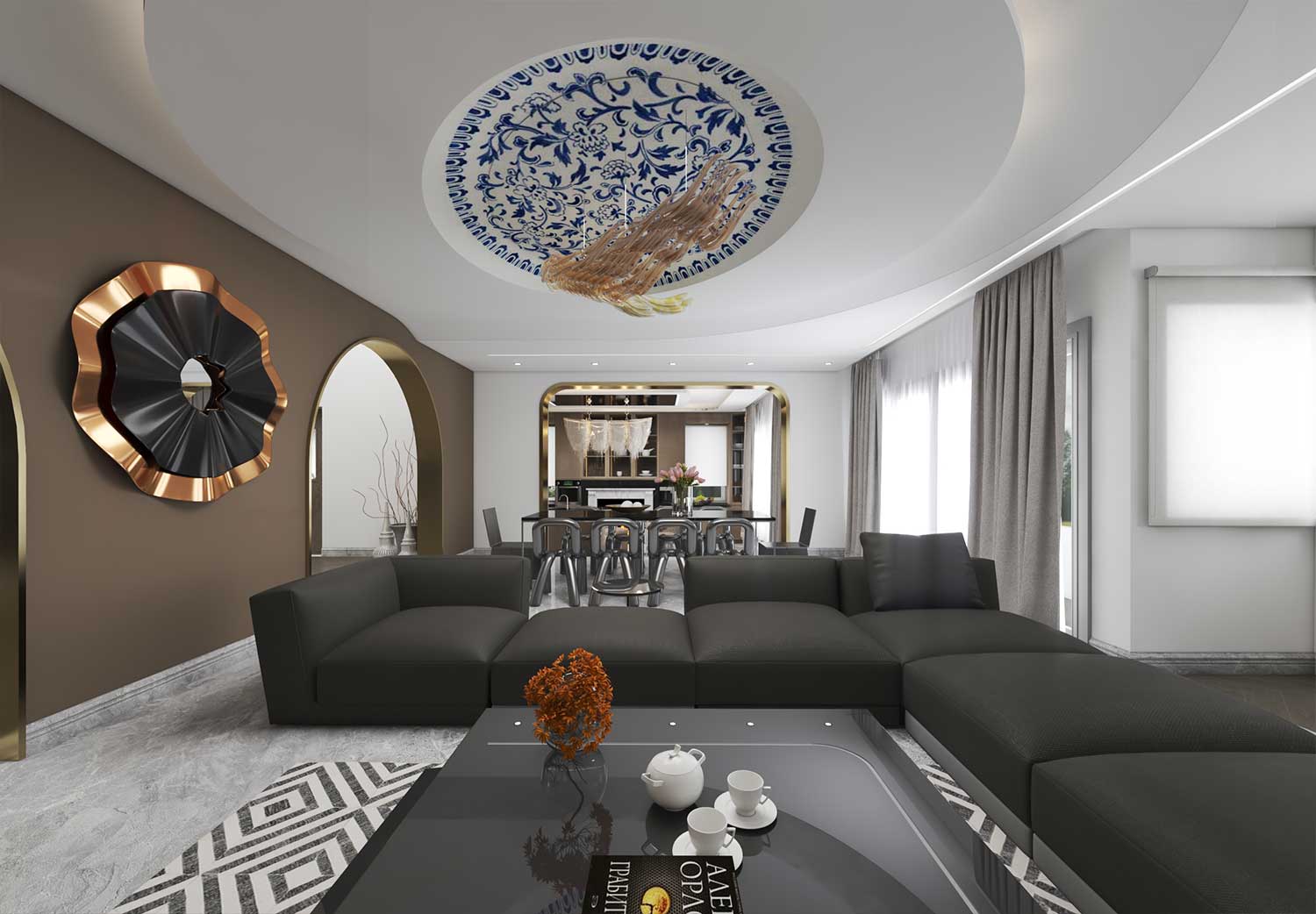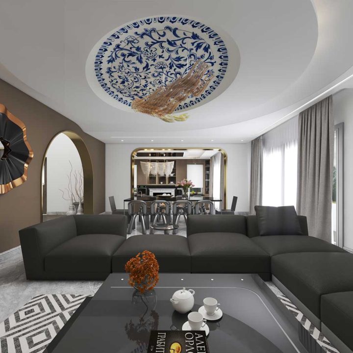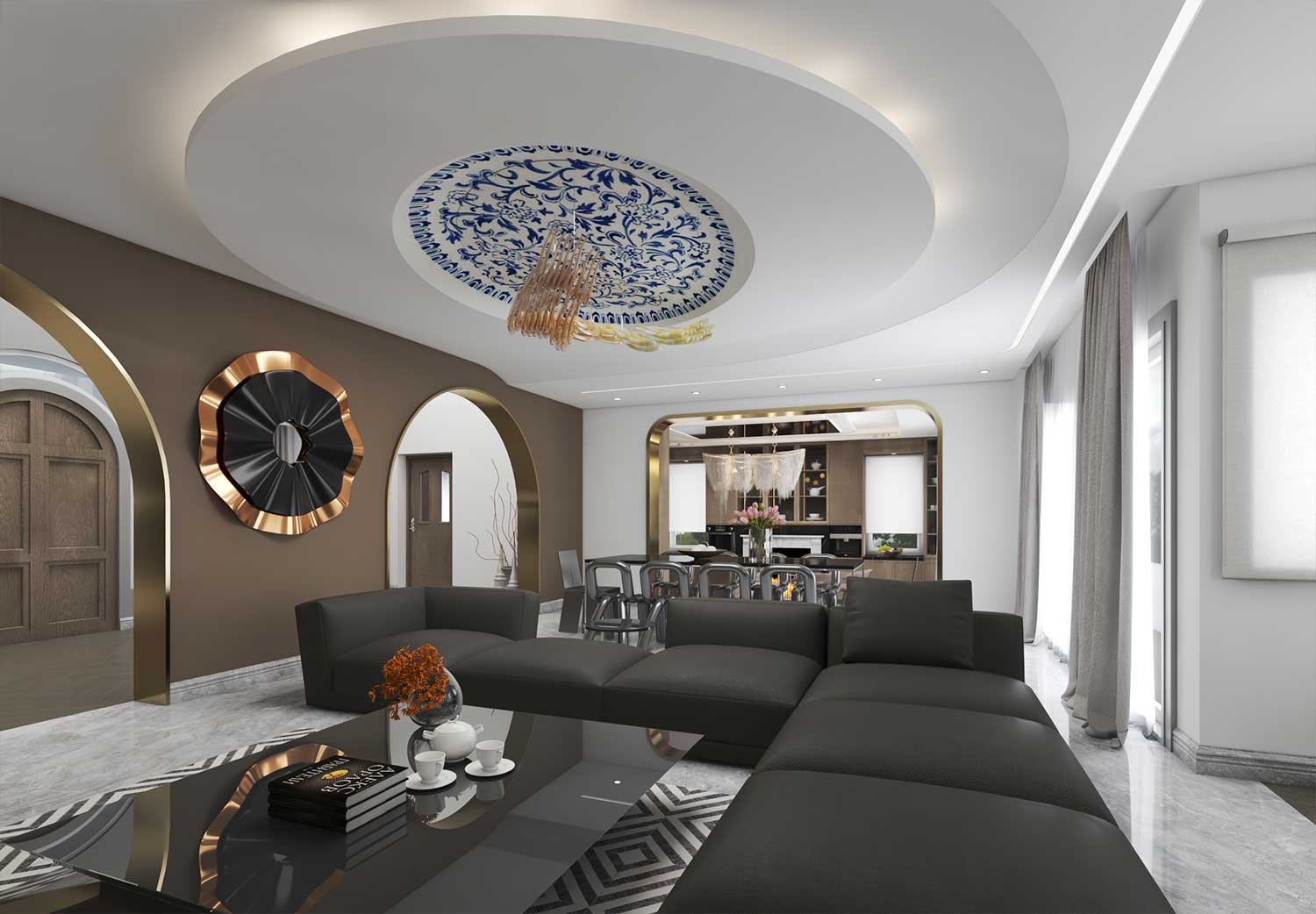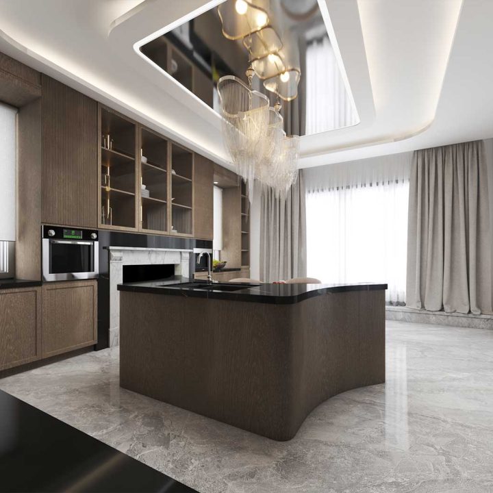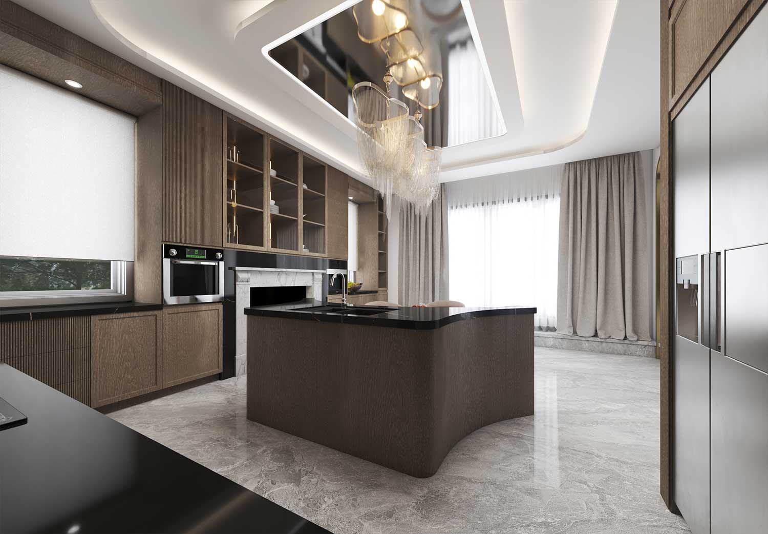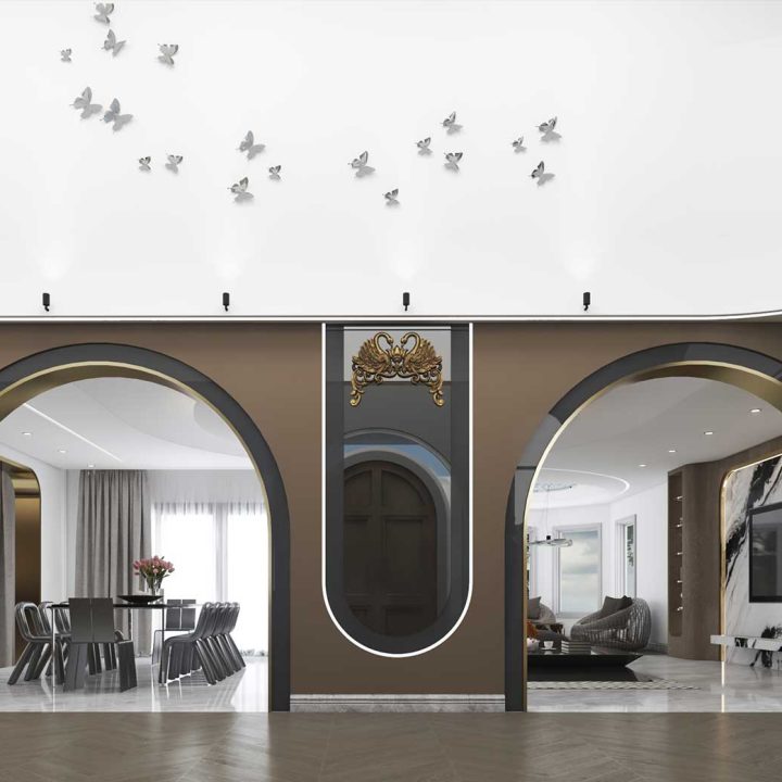 •ویژگیهای معماری: دهانه قوسی بزرگ با قاب طلایی، جلوهای باشکوه به فضا داده و دیدی زیبا به آشپزخانه ایجاد کرده است. طراحی سقف در بالای قوس، که شامل یک المان هنری شبیه به کاشیکاری یا سرامیک تزئینی است، هویت و جذابیت فرهنگی خاصی به فضا بخشیده است.