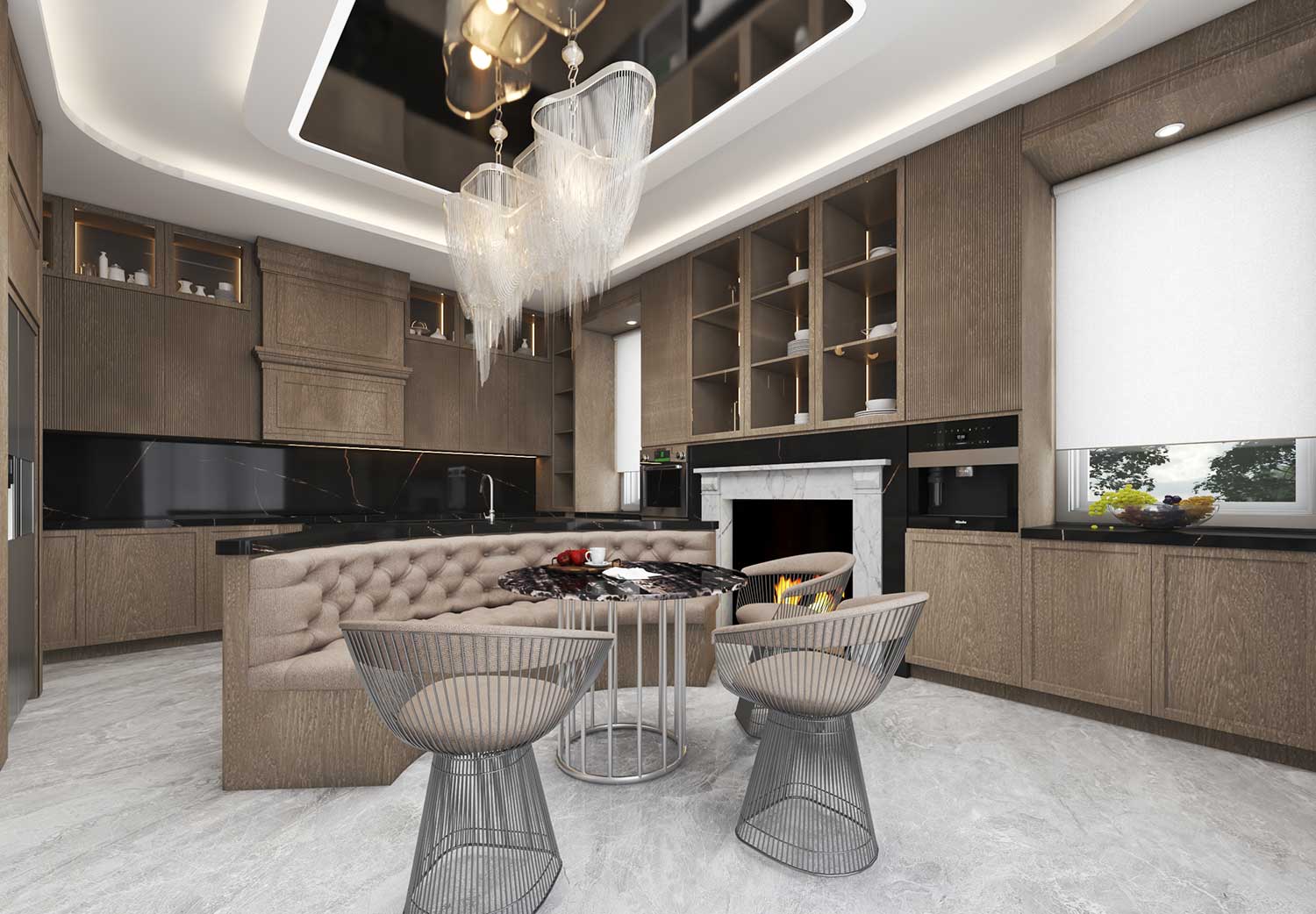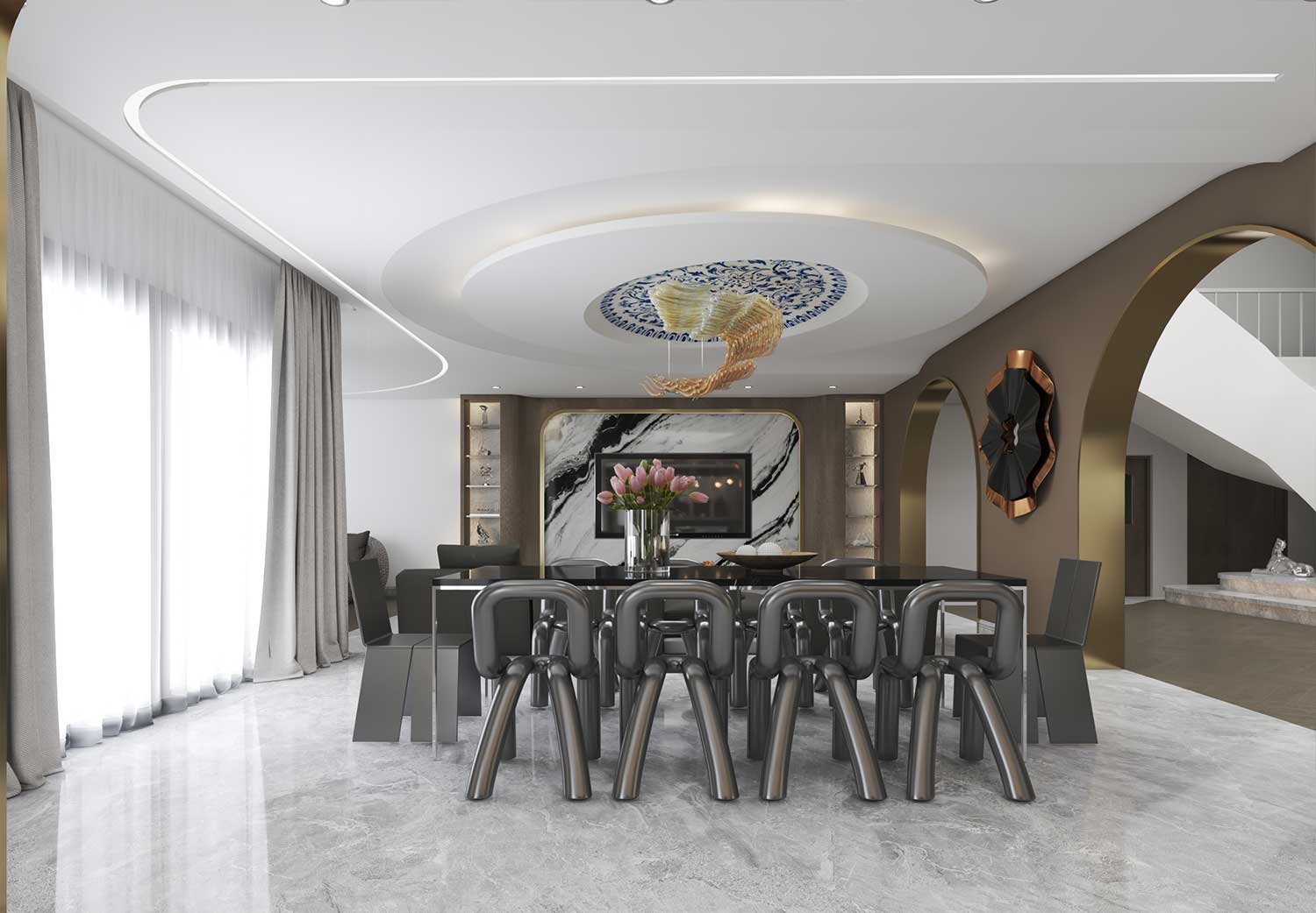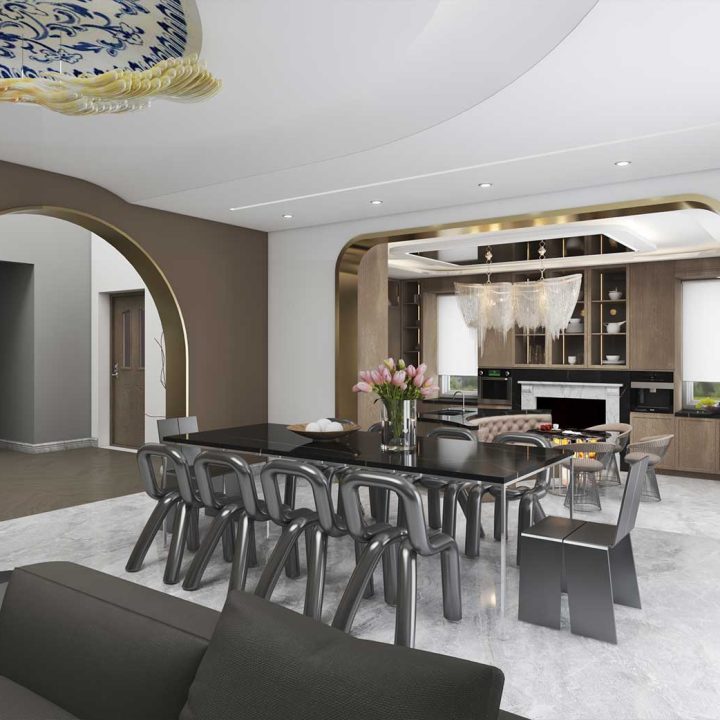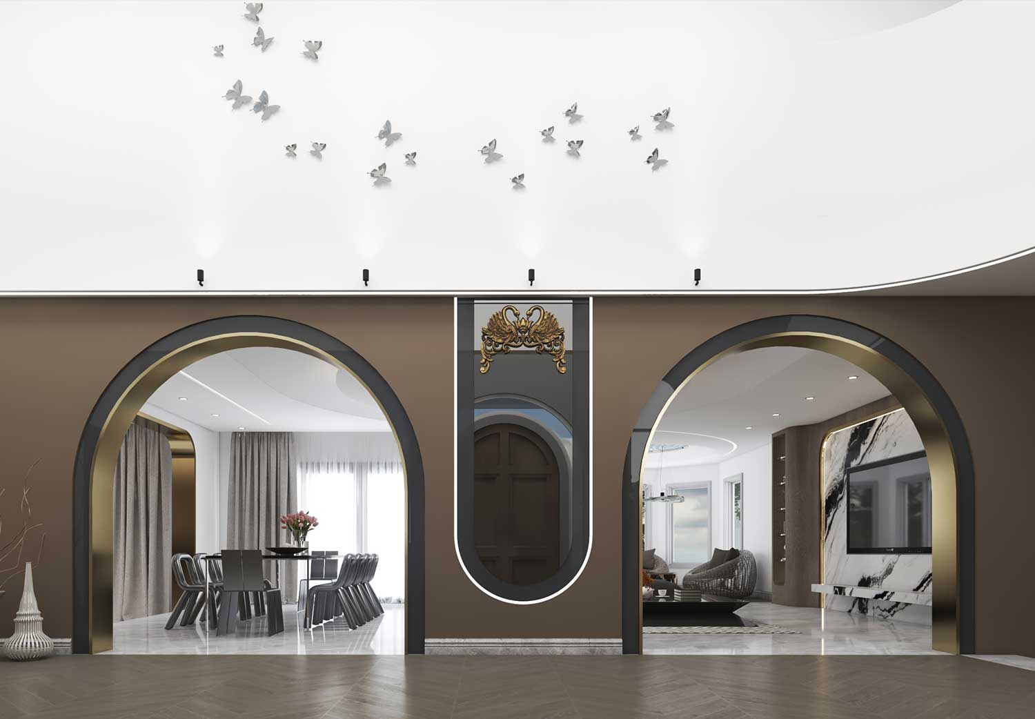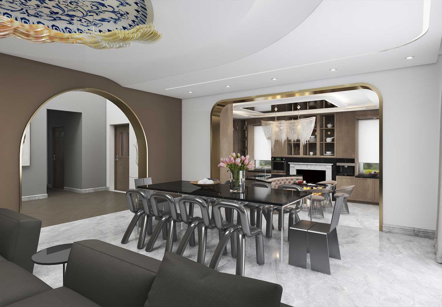 •چیدمان و ارتباط فضاها: ارتباط روان و بیمرز بین فضای ناهارخوری و آشپزخانه، که با یک قاب قوسی طلایی مشخص شده، باعث ایجاد حس باز بودن و دعوتکنندگی میشود، در حالی که مرزبندی ملایمی نیز بین فضاها ایجاد میکند.