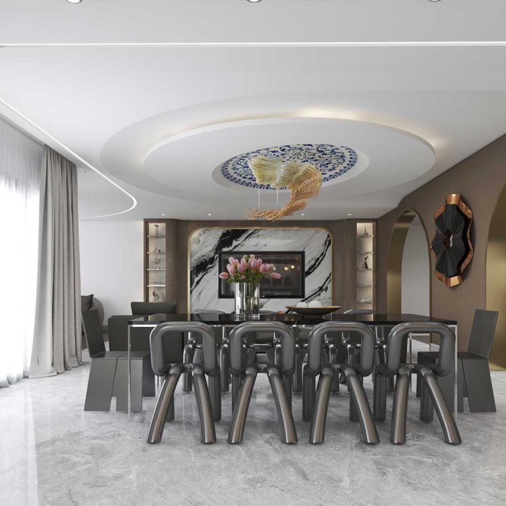 •فضای ناهارخوری: میز ناهارخوری مشکی براق در کنار صندلیهای فلزی با فرمهای مجسمهگونه، نقطه کانونی و جسورانهای برای فضا ساخته است. گلهای تازه در مرکز میز، حال و هوایی لطیف و طبیعی به ترکیب کلی افزودهاند.