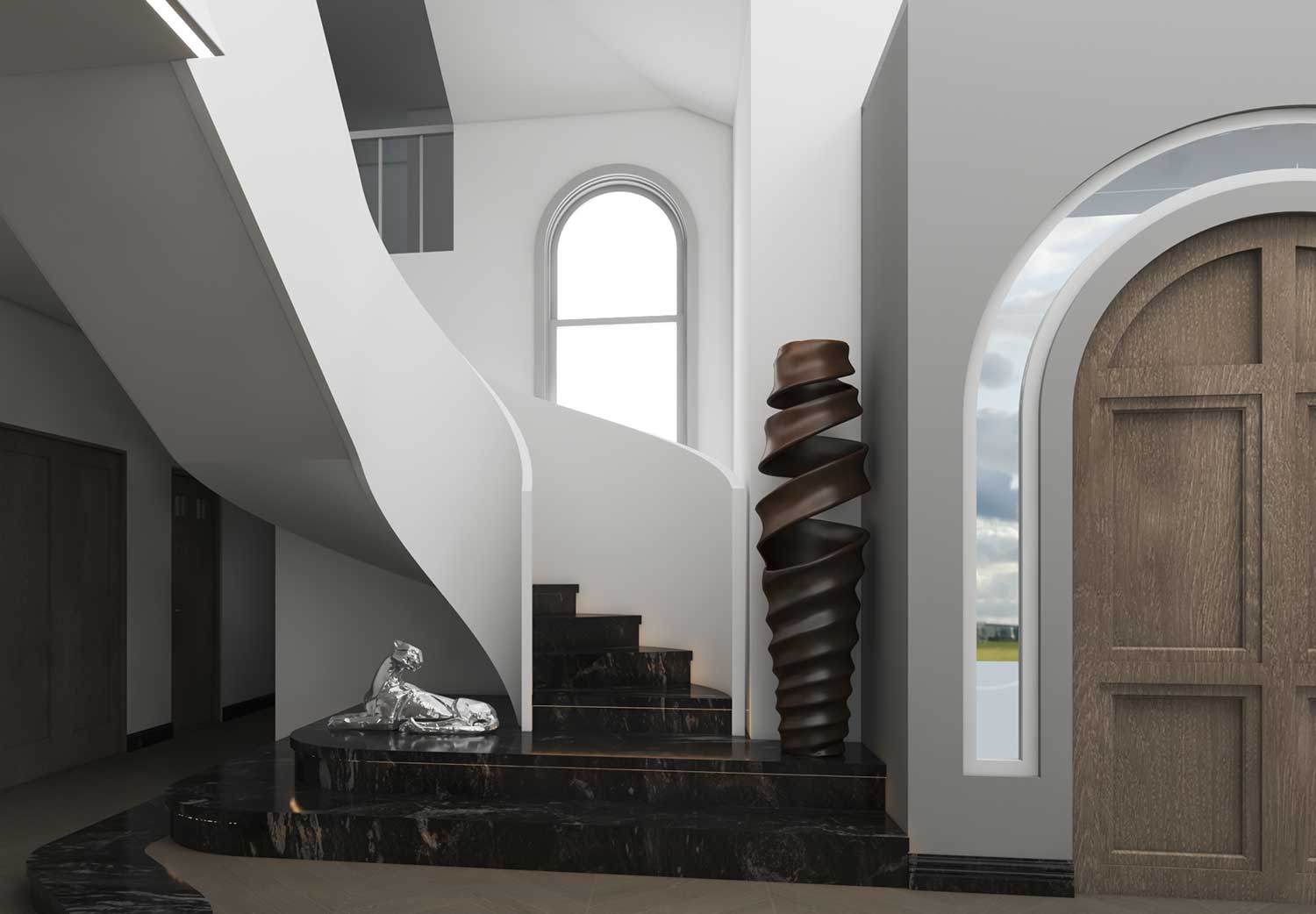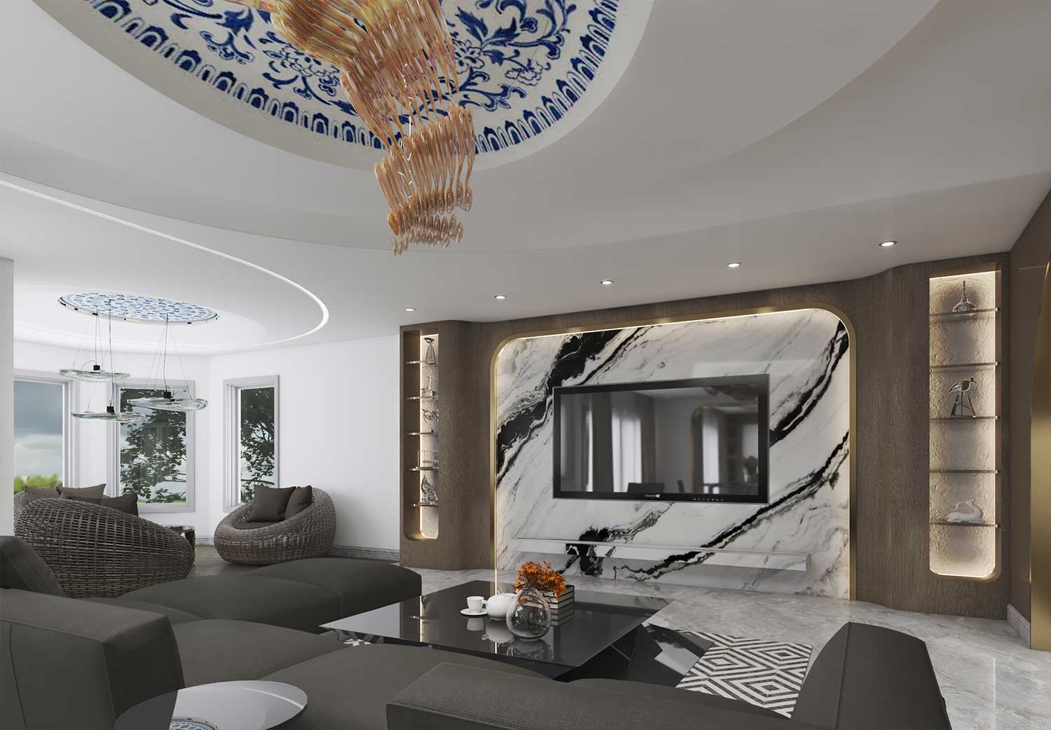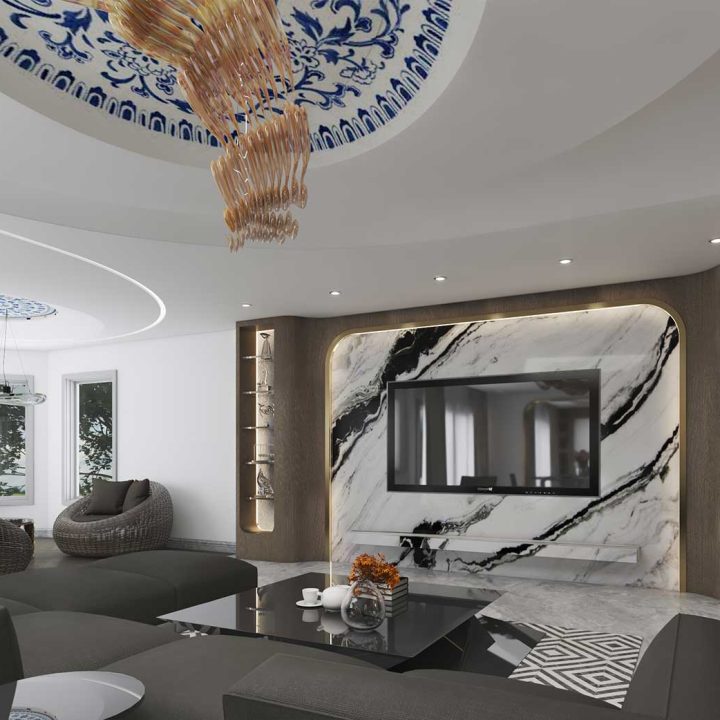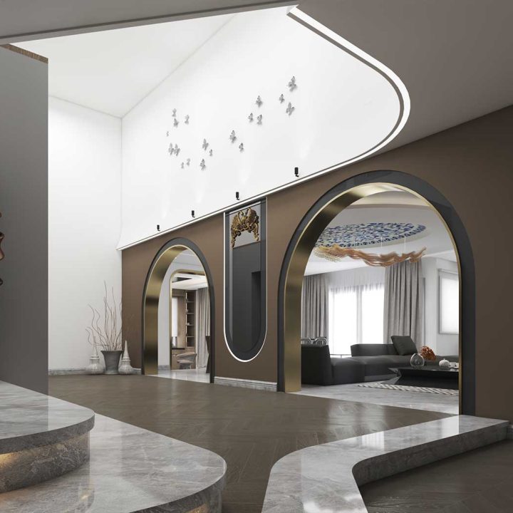 •پالت متریال: کفپوش مرمر صیقلی با انعکاس نور، حس وسعت و روشنایی را تقویت میکند. ترکیب جزئیات طلایی، دیوارهای قهوهای گرم و رنگهای خنثی، فضایی لوکس و صمیمی ایجاد کرده است.